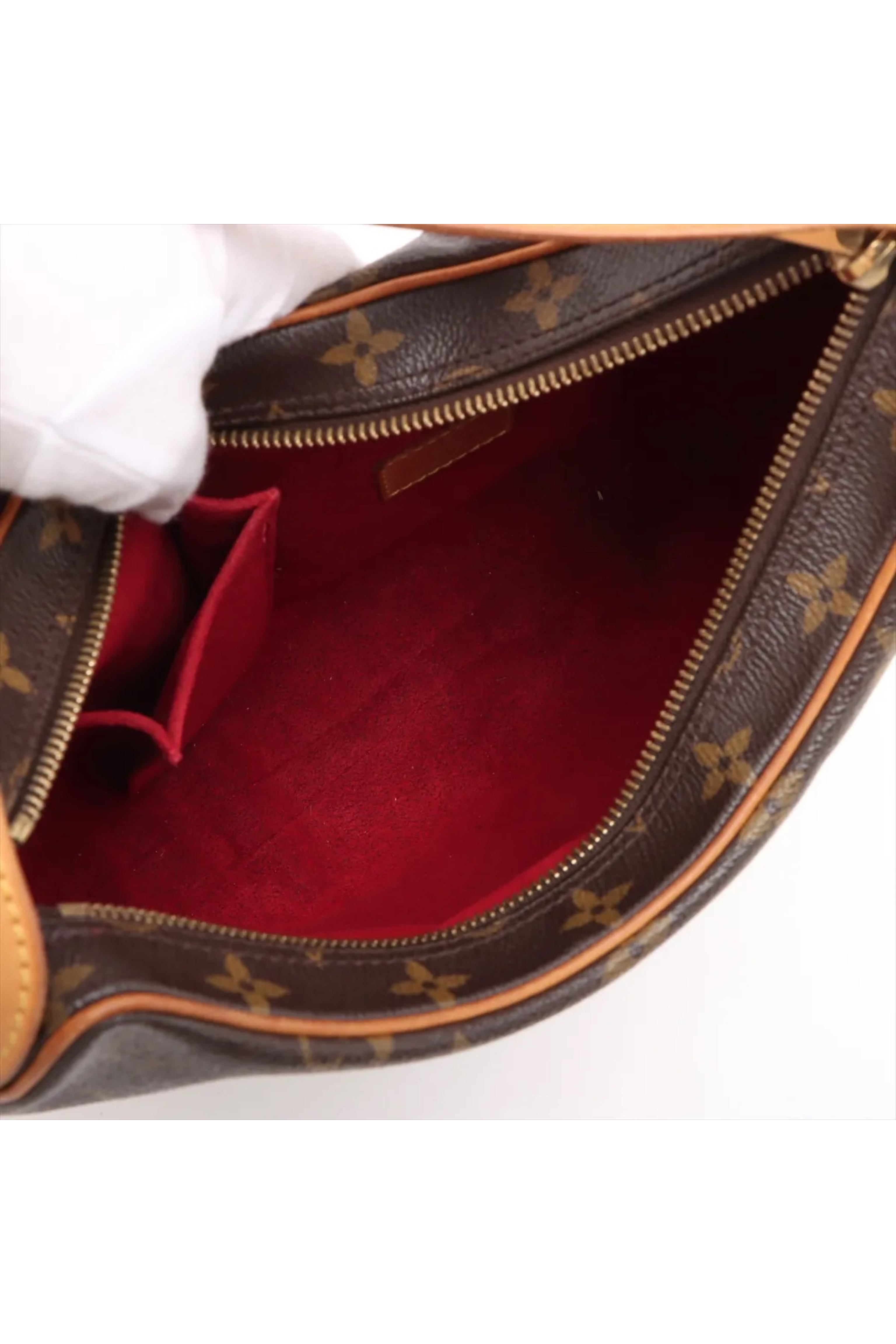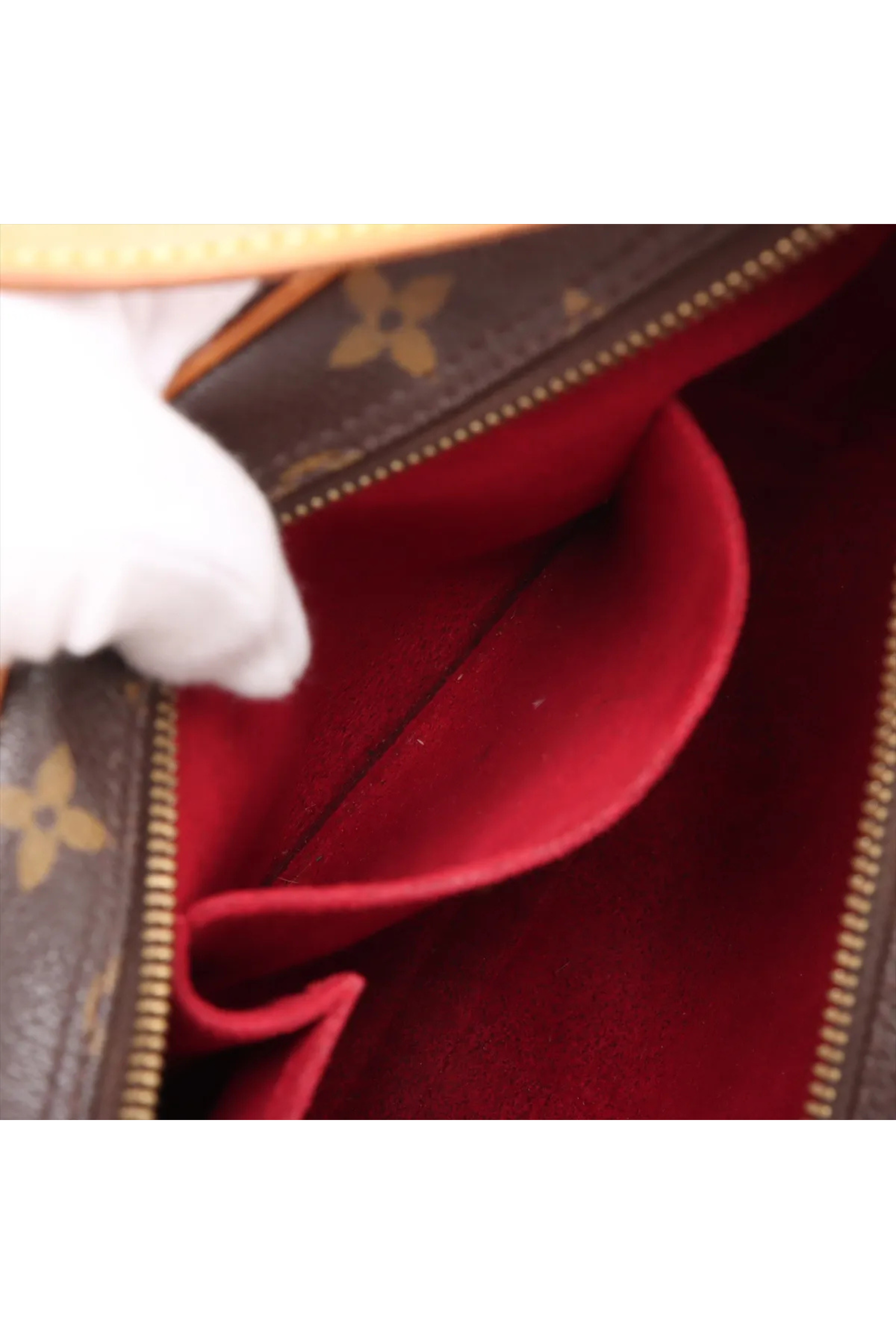 Tasken er smukt fremstillet i Louis Vuittons klassiske Monogram Canvas med en elegant, justerbar skulderrem i lyst Vachetta-læder og skinnende guldfarvet hardware. Når du åbner den bløde lynlås, afsløres et luksuriøst indre foret med rød Alcantara (mikrofiber), som både er smukt at se på og utroligt slidstærkt. Tasken har god plads til dine vigtigste must-haves og rummer desuden en praktisk lille stiklomme indvendigt.