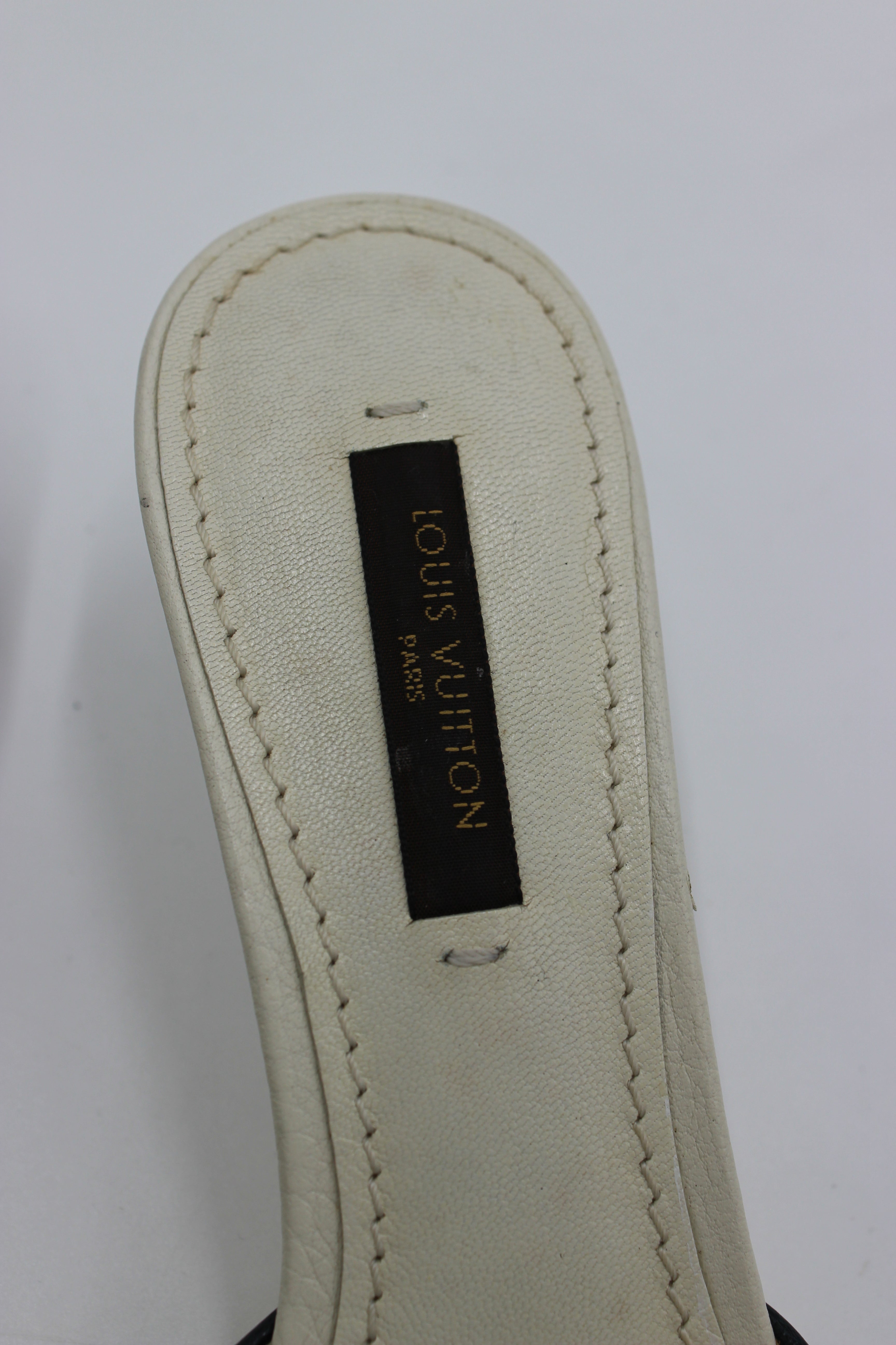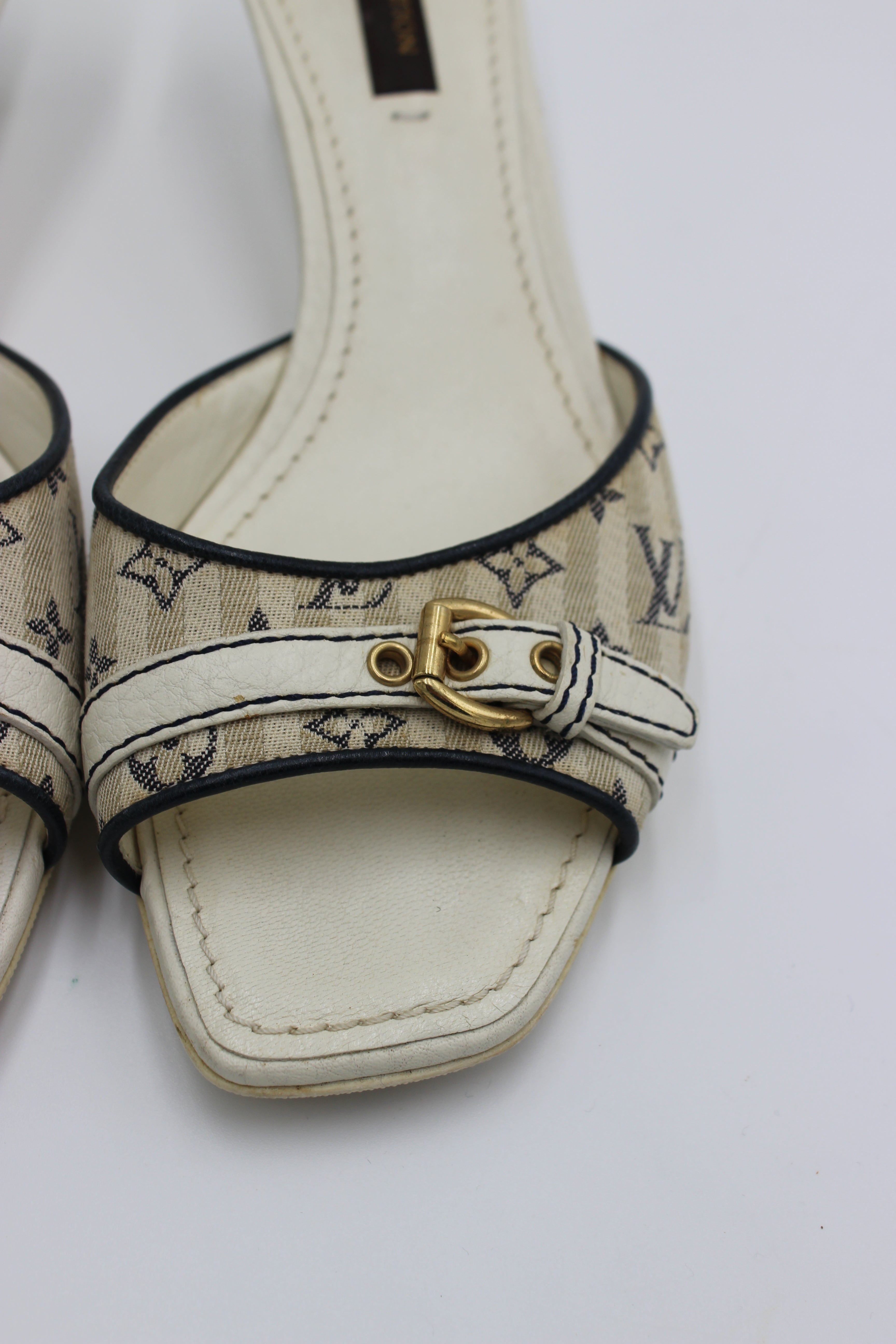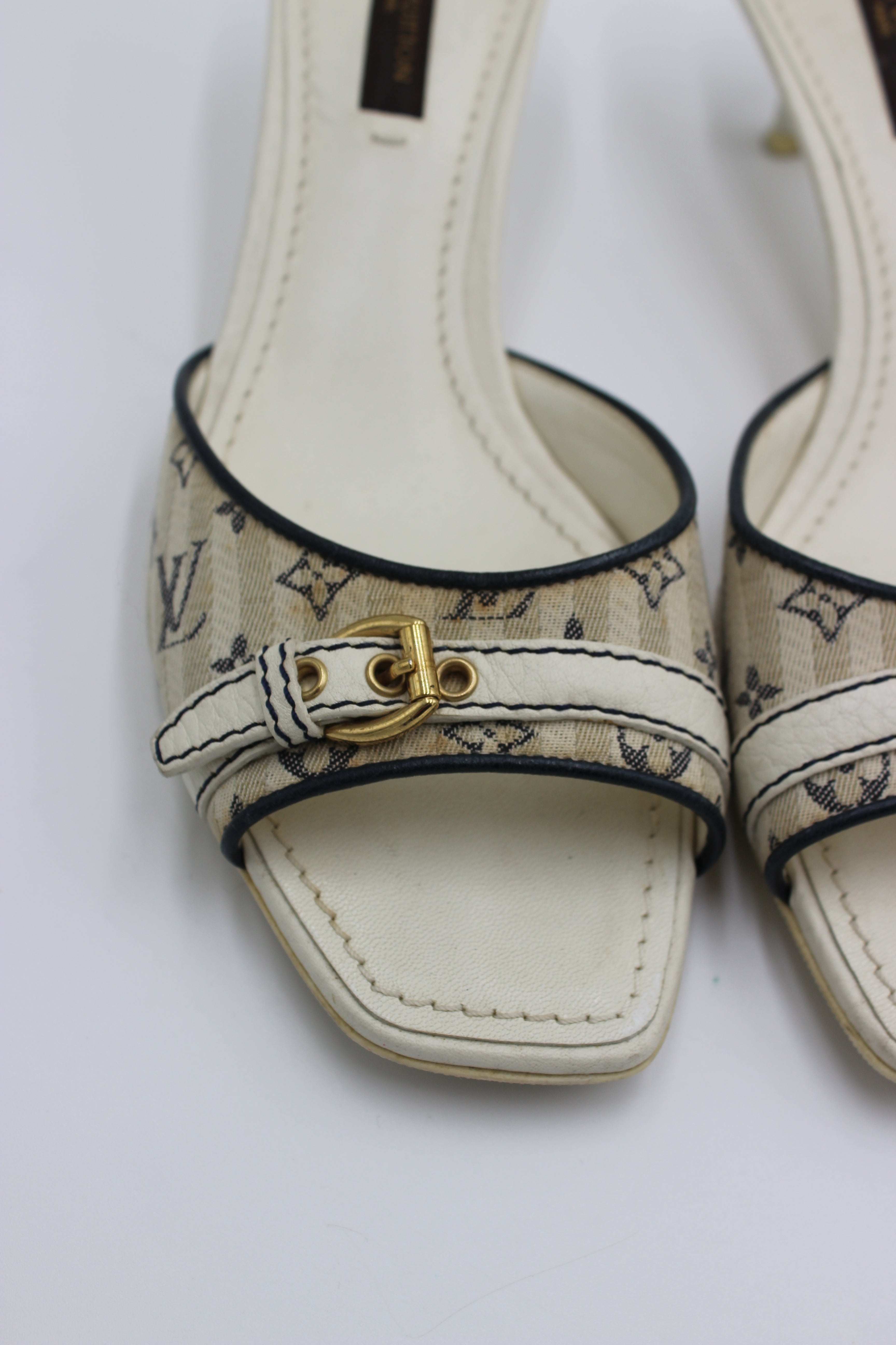 Disse smukke slip-in sandaler (mules) er designet med en base i hvid/creme nuancer og sort kantning, hvilket fremhæves smukt af den brede rem over vristen i det ikoniske Louis Vuitton Monogram canvas. Som en ekstra feminin detalje har remmen et fint lille spænde. Den moderne firkantede snude (square toe) giver skoen et chikt og tidløst udtryk, der nemt kan styles op og ned – uanset om det er til en let sommerkjole eller et par smarte jeans.