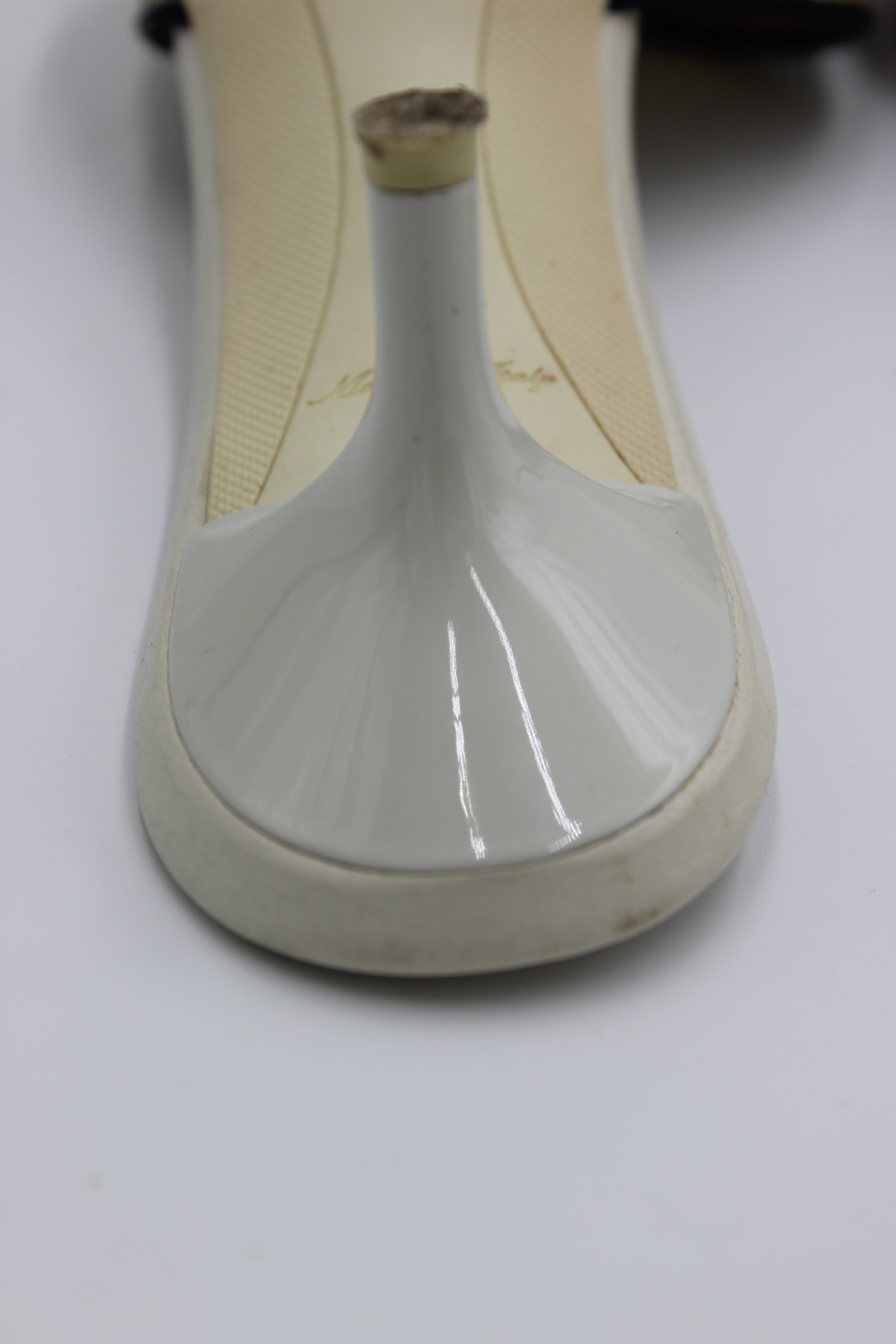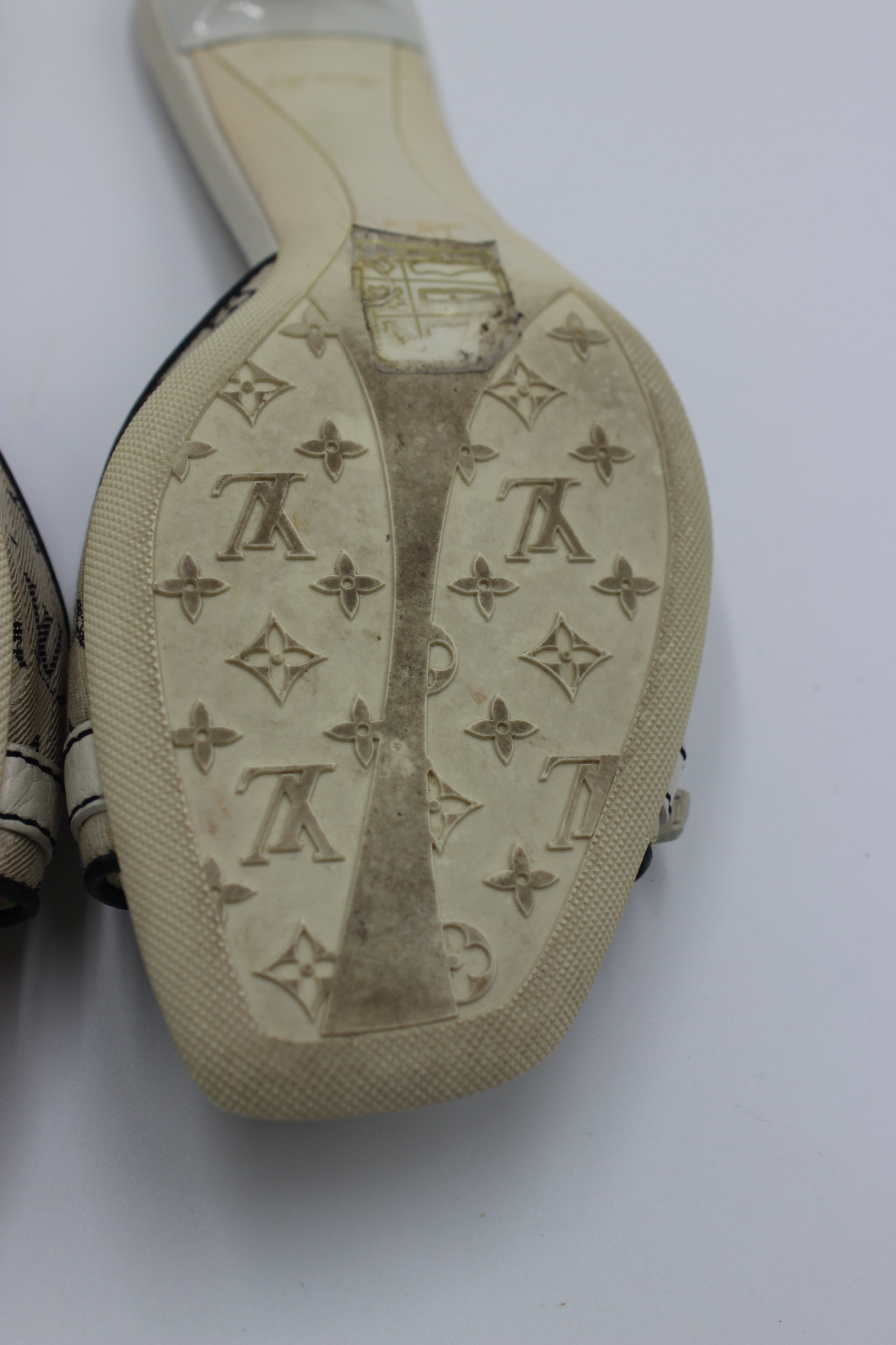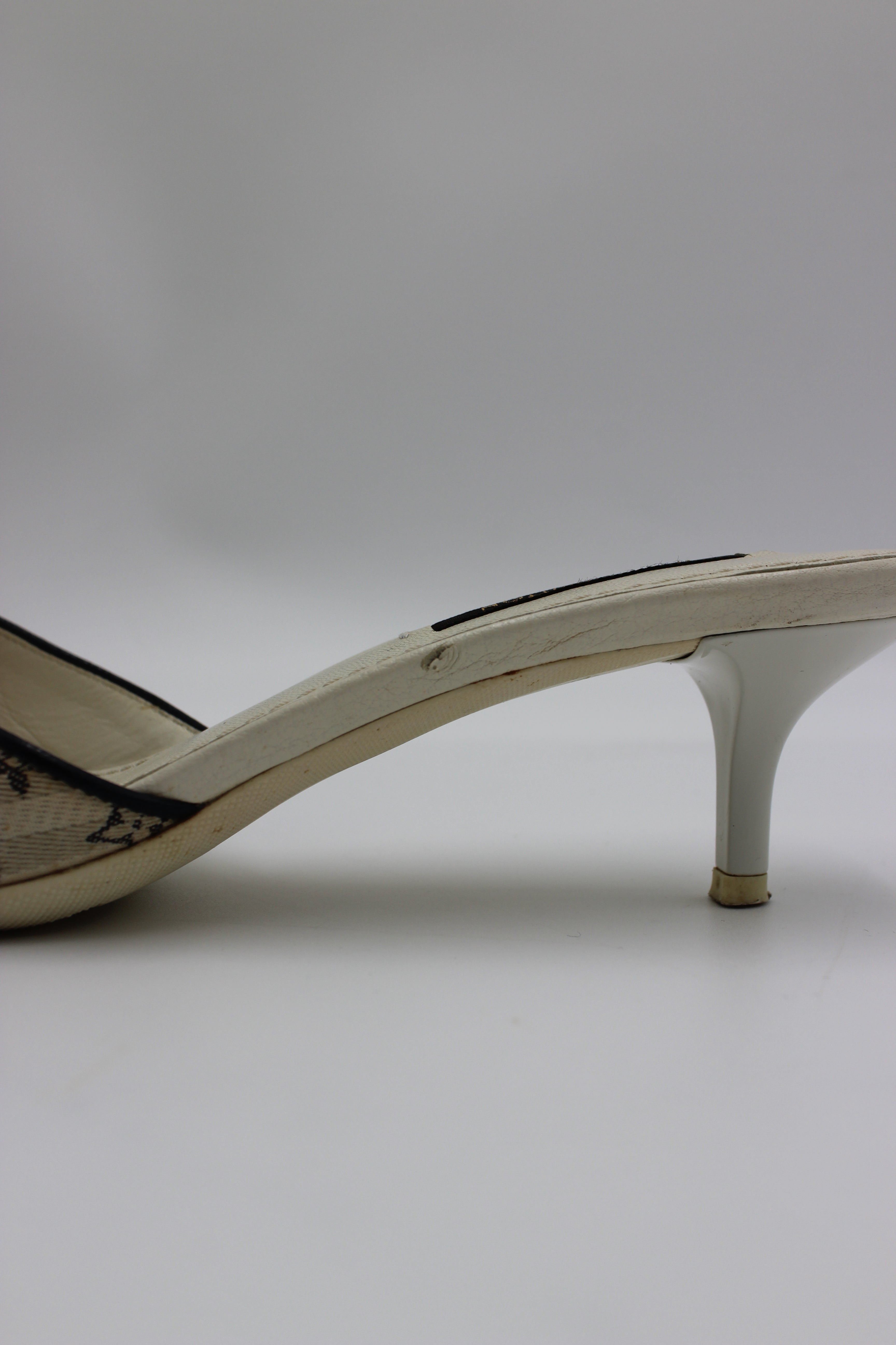 Disse smukke slip-in sandaler (mules) er designet med en base i hvid/creme nuancer og sort kantning, hvilket fremhæves smukt af den brede rem over vristen i det ikoniske Louis Vuitton Monogram canvas. Som en ekstra feminin detalje har remmen et fint lille spænde. Den moderne firkantede snude (square toe) giver skoen et chikt og tidløst udtryk, der nemt kan styles op og ned – uanset om det er til en let sommerkjole eller et par smarte jeans.